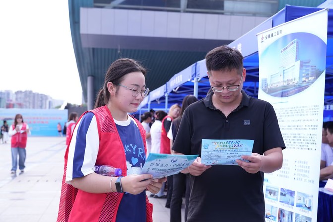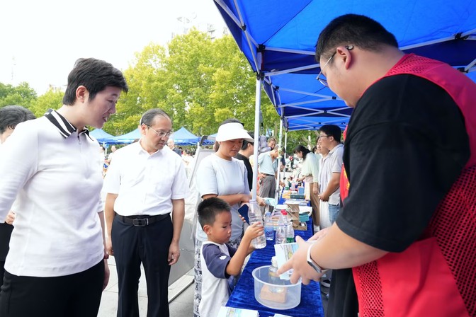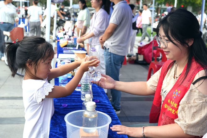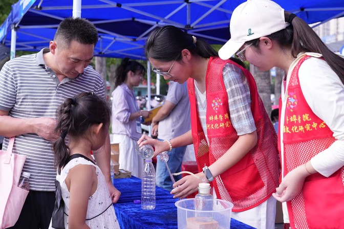 活动期间,淮河文化研究中心的展区吸引了大量市民与游客驻足。中心围绕“淮水安澜·文明传承·生态赋能”的展示思路,通过图文展板、实验体验宣传讲解以及向来往市民发放淮河文化宣传材料等多种形式,生动展现了淮河流域悠久灿烂的历史文化、治水兴水的科技智慧以及鲜明的地域文化