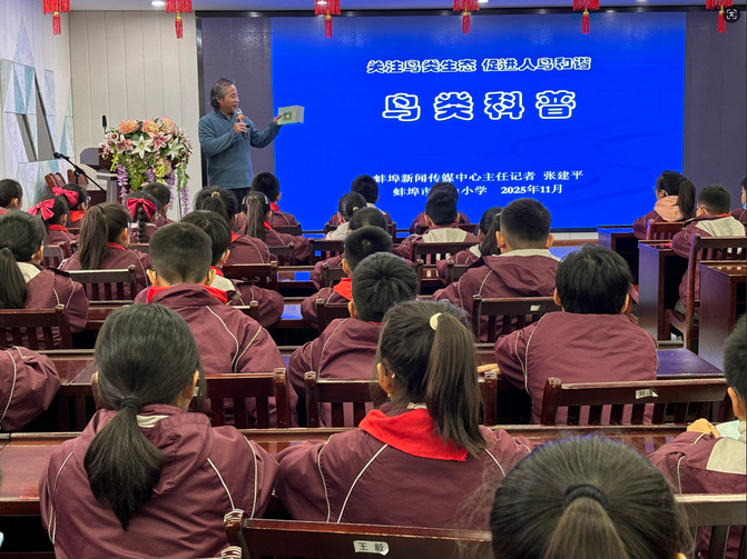 活动伊始,张建平老师凭借丰富的从业经验与深厚的专业积累,以“认识淮河畔的鸟类朋友”为主题展开宣讲。他结合生动的案例、形象的图片,从鸟类的生活习性、栖息环境,到淮河生态与鸟类生存的密切关联,用通俗易懂的语言为同学们揭开了鸟类世界的神秘面纱。“淮河是我们的母亲河,也是许多鸟类的家园,大家知道蚌埠常见的水鸟有哪些吗?”张老师的提问引发了同学们的热烈回应,现场举手抢答的身影此起彼伏。