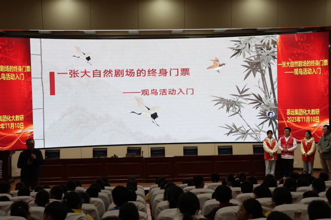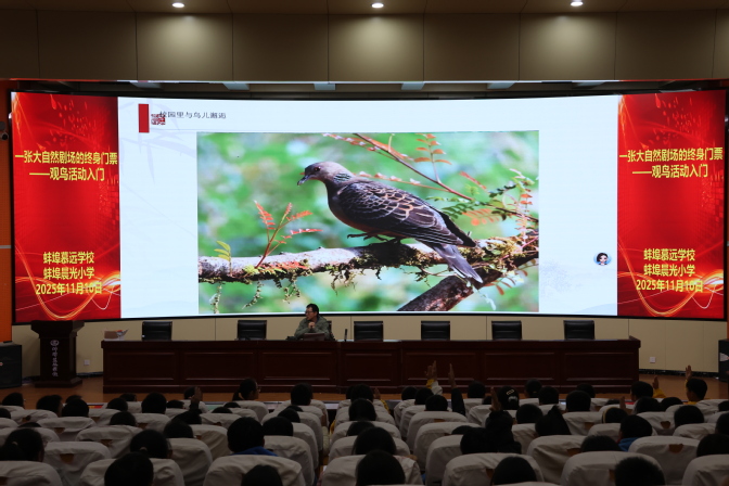 活动中,市野生动植物保护协会副会长董斌斌以“一张大自然剧场的终身门票——观鸟活动入门”为主题,用通俗易懂的语言和生动有趣的案例,向同学们介绍了淮河流域常见鸟类的生活习性、外形特征及保护现状。讲座过程中,董老师展示了多种鸟类的高清照片,并设置了“鸟类猜猜看”互动环节,同学们踊跃参与,积极抢答,现场气氛活跃。