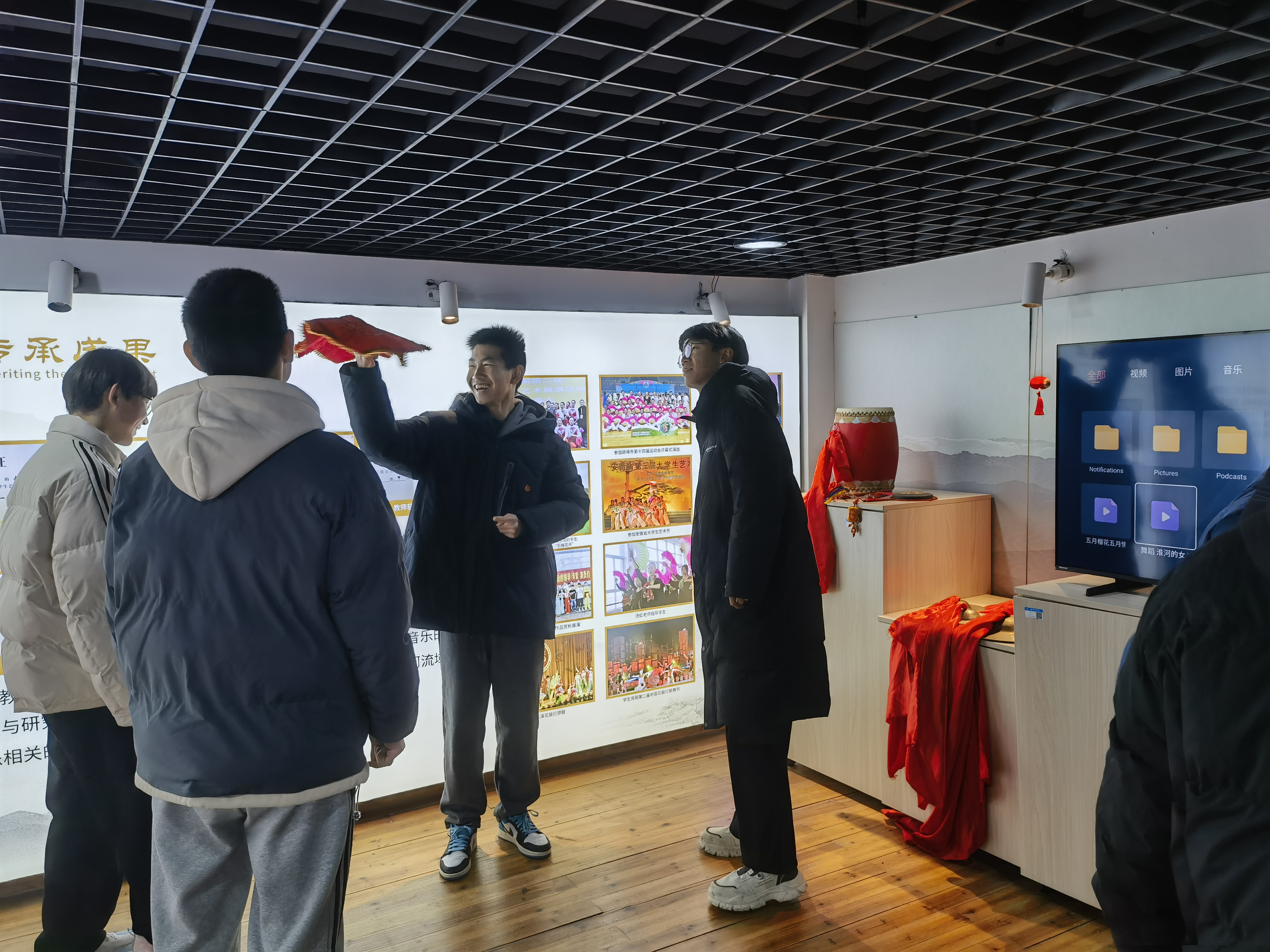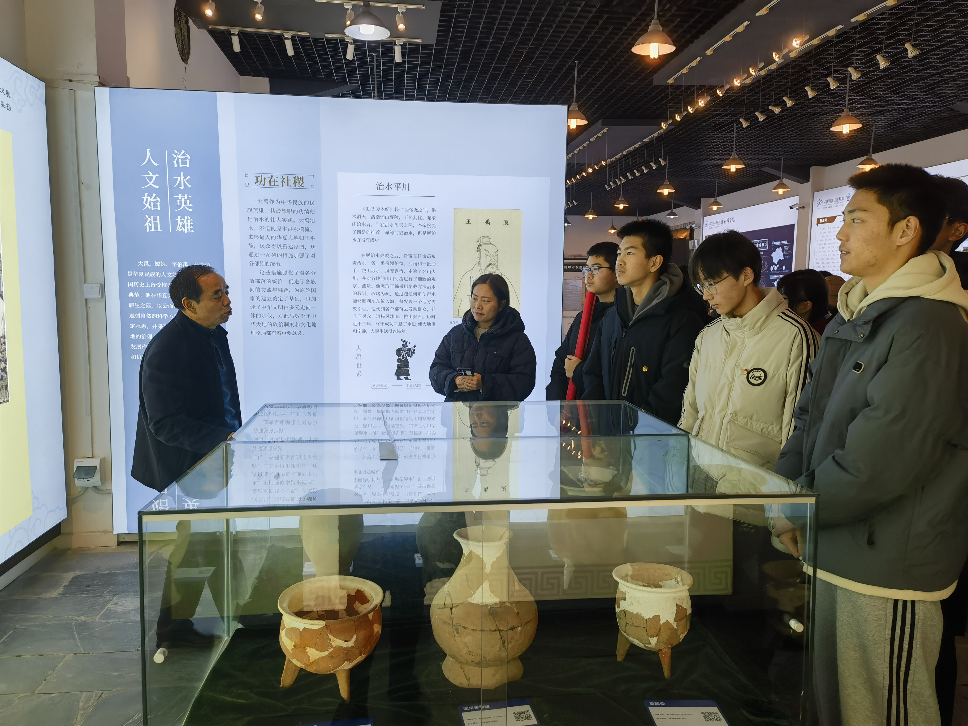 活动中,淮河文化研究中心主任吴长法教授带领中学生团队走进淮河文化展馆,通过"大手拉小手"的教学模式,以淮河文化为载体,将地域历史文化与思政教育深度融合。中心陈佳老师以蚌埠禹会村遗址、双墩文化、大禹文化等为切入点,引导学生探讨传统文化中的家国情怀;学生们则通过疑问互答,扫二维码观看文物讲解等形式,沉浸式体验非遗技艺,实现从"听众"到"主角"的角色转换。